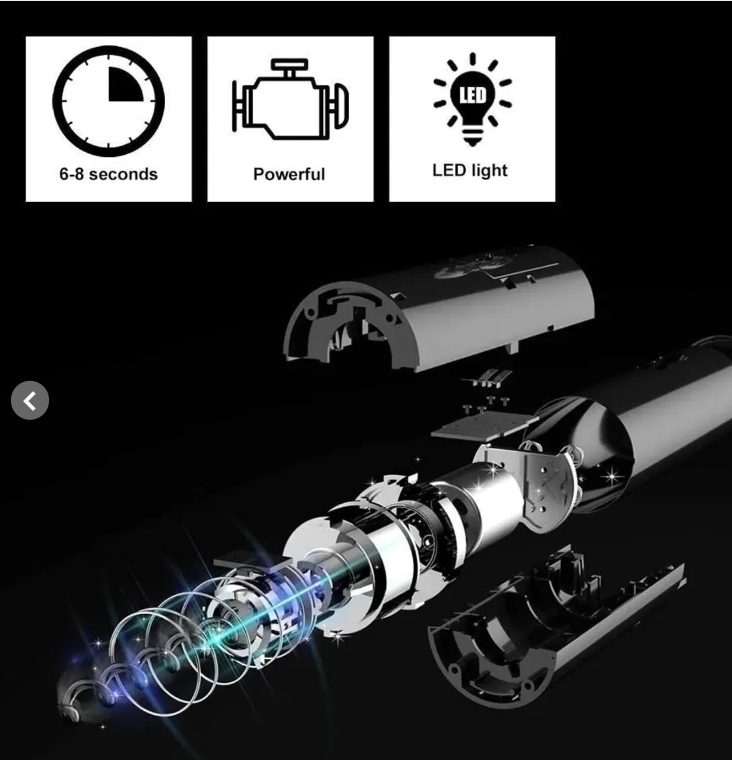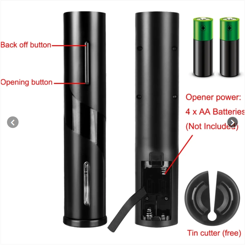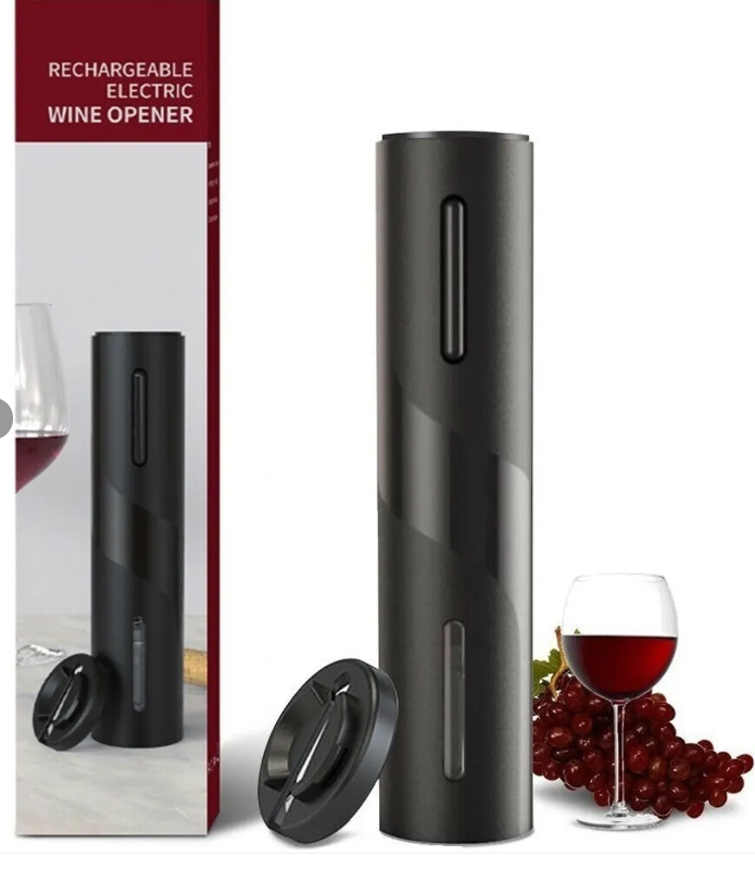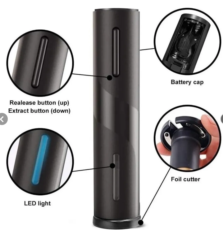 Destapador de Vino Automático, ideal para sacar los corchos des botellas de forma fácil y sin la necesidad de aplicar fuerza. Posee un botón de un solo toque que se presiona y se mantiene pulsado hasta sacar el corcho. Cuerpo de metal mate duradero: diseño cómodo y hermoso, brillante y respetuoso con el medio ambiente.